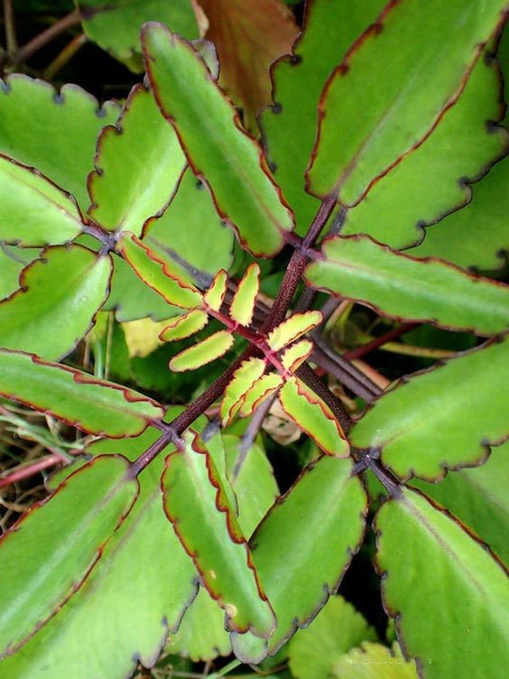 دارای برگهای گوشتی و دندانه دار است که به دلیل شکل خاص برگها و ساقهها به کالانکوئه شش زاویهای معروف است.