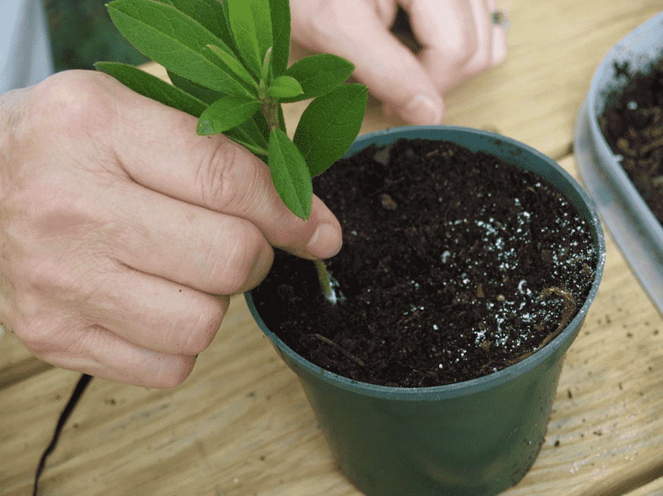 شاخه را در داخل عمق حفر شده قرار دهید و روی آن را با تقریباً ۱۰-۱5 سانتی متر از خاک گلدان بپوشانید.