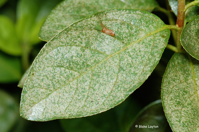 روی برگها نقاط ریز زرد رنگ و زیر برگها فضولات سیاه رنگ حشره به همراه گرد و غبار مشاهده میشود.