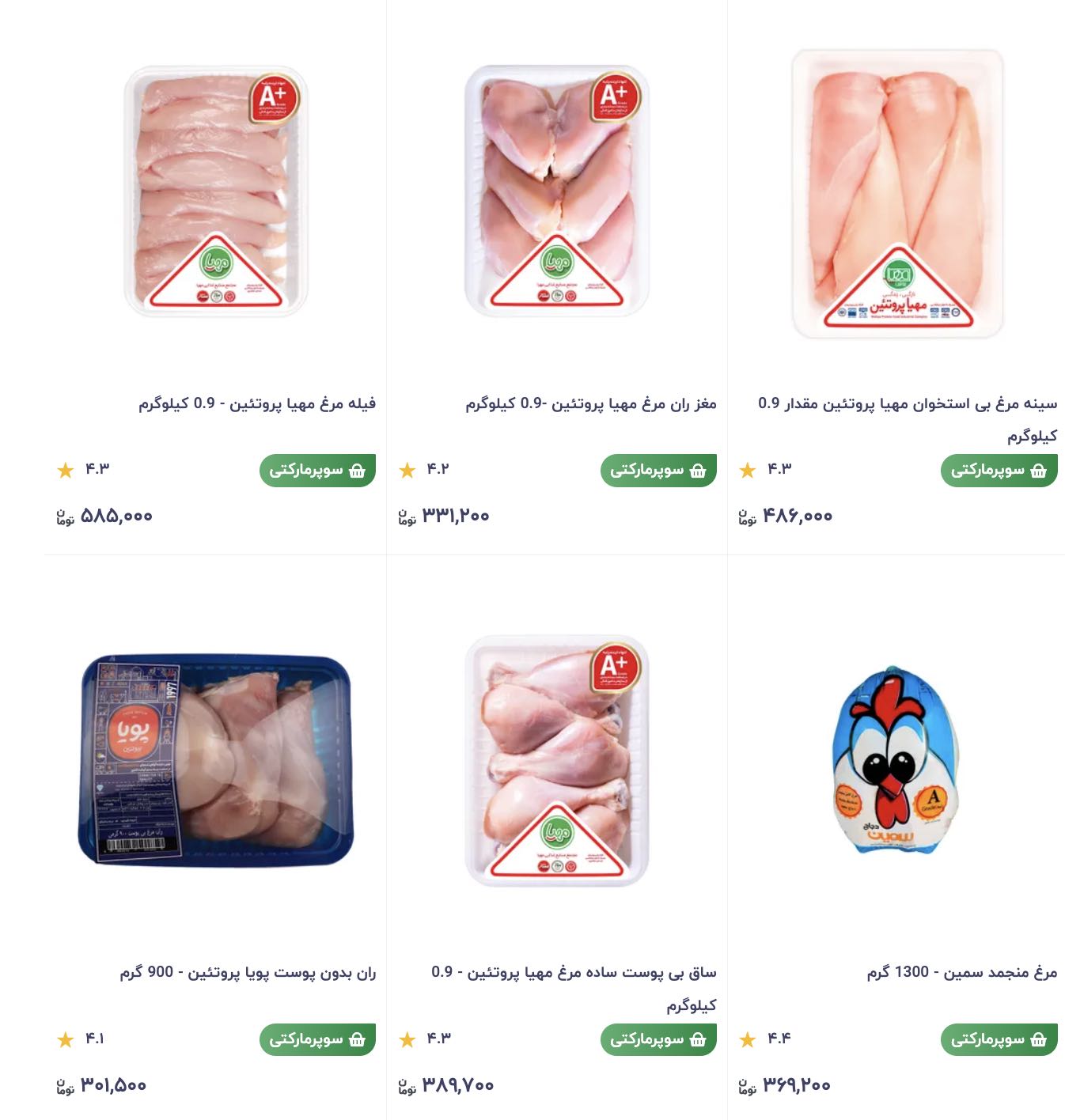 درحال حاضر قیمت مرغ منجمد سمین با وزن ۱.۱کیلوگرم ۲۶۹.۵ هزارتومان به فروش میرسد.مغز ران مرغ مهیا پروتئین با وزن ۹۰۰گرم نیز ۳۳۱ هزارتومان قیمت گذاری شده است