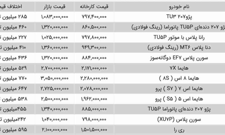 | نام خودرو | قیمت کارخانه | قیمت بازار | اختلاف قیمت |