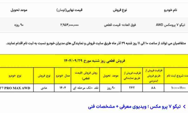 به نقل آخرین خودرو؛شرکت مدیران خودرو شرایط فروش کراس اوور پرفروش خود را ویژه آذر ماه ۱۴۰۴ اعلام کرد. در شرایط فروش مدیران خودرو تیگو ۷ پرومکس AWD به صورت فروش فوق العاده عرضه می شود. موعد تحویل اعلامی برای این خودرو ۹۰ روزه است و قیمت نیز به صورت قطعی می باشد. قیمت تیگو ۷ پرومکس دو دیفرانسیل در شرایط فروش مدیران خودرو ۲,۹۵۴,۰۰۰,۰۰۰ تومان است.