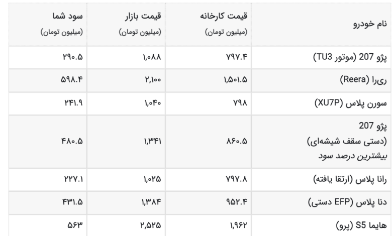 از نظر درصد سود، پژو 207 سقف شیشهای با حدود ۵۵.۸ درصد و از نظر مبلغ سود، هایما 8S با حدود ۹۲۹ میلیون تومان، پرسودترین گزینهها هستند.